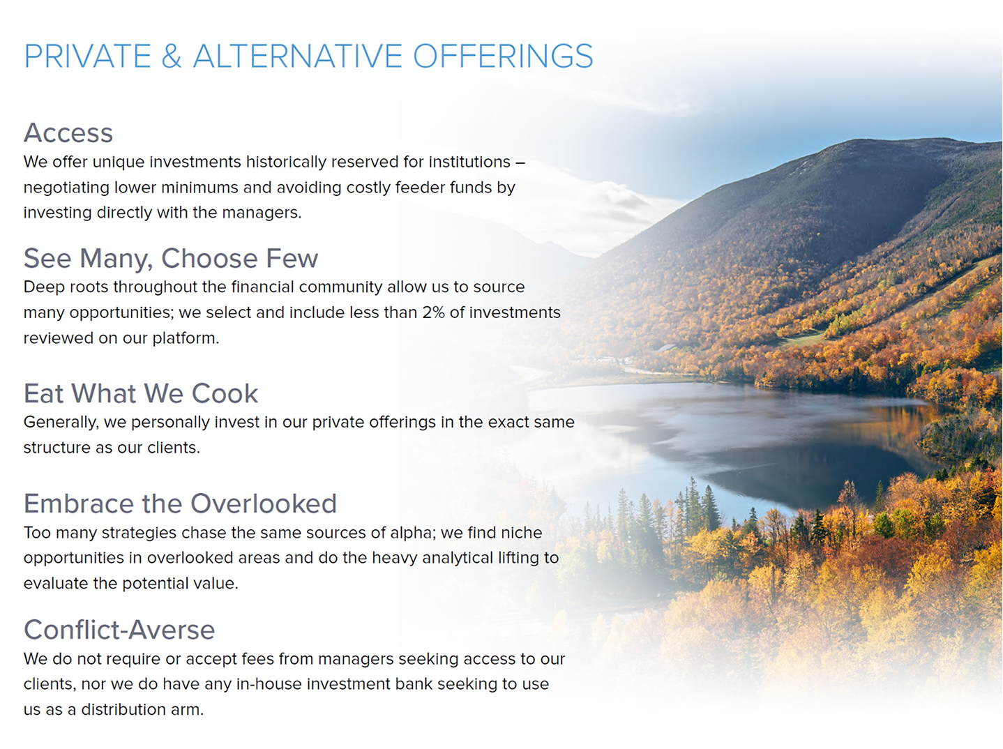 Complete and bespoke – our advisory platform and solutions are designed to meet your every need – investments, taxes, risks, estate, philanthropy, concierge services and more.